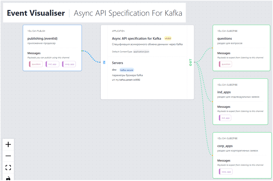 Наконец, еще одной полезной функцией AsyncAPI Studio является визуализация потокового конвейера отправки сообщений от продюсера через сервер к каналам, на которые может подписаться потребитель. Примечательно, что это диаграмма строится автоматически, на основании заданной YAML-спецификации.