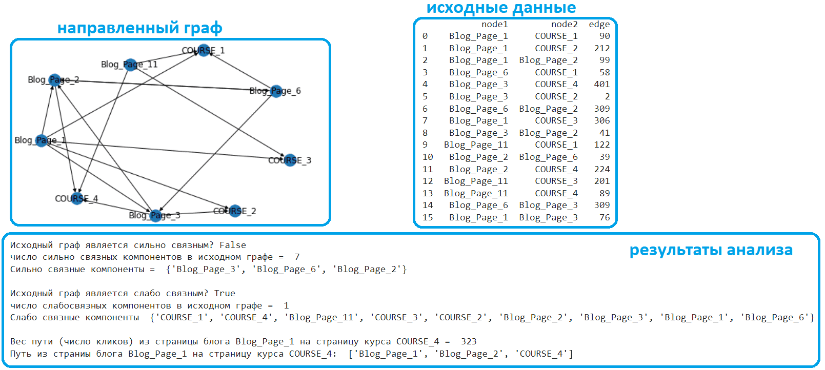 Наконец, определим в рассматриваемом графе пользовательского движения по веб-сайту, кратчайший путь с отдельной страницы блога на конкретную страницу курса. А также определим общее количество этих переходов за сутки (сумма кликов) из этого взвешенного пути, используя алгоритм Дейкстры, о котором мы писали здесь.