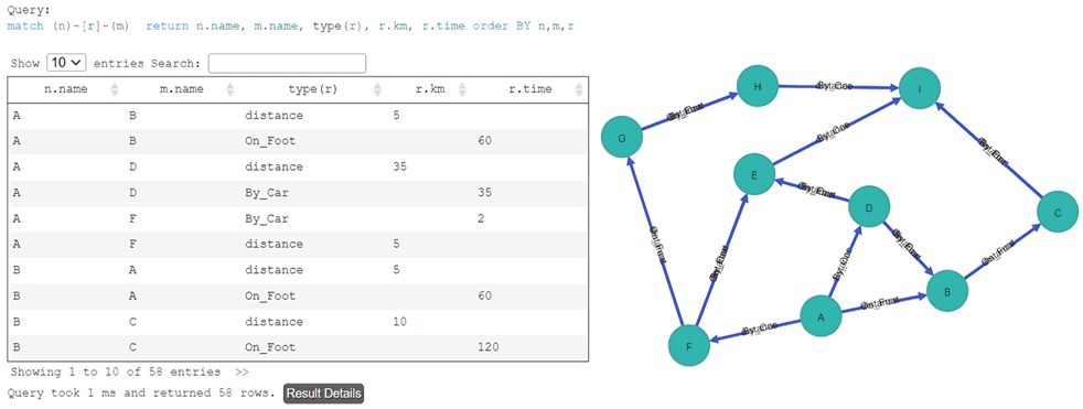 match (n)-[r]-(m) return n.name, m.name, type(r), r.km, r.time ORDER BY n,m,r