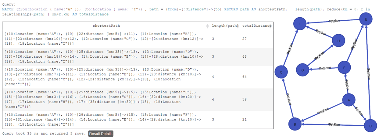 Далее составим Cypher-запрос для вычисления путей между точками А и I с указанием расстояния и длины пути, т.е. количества вершин, которые нужно обойти – за это отвечает функция length():