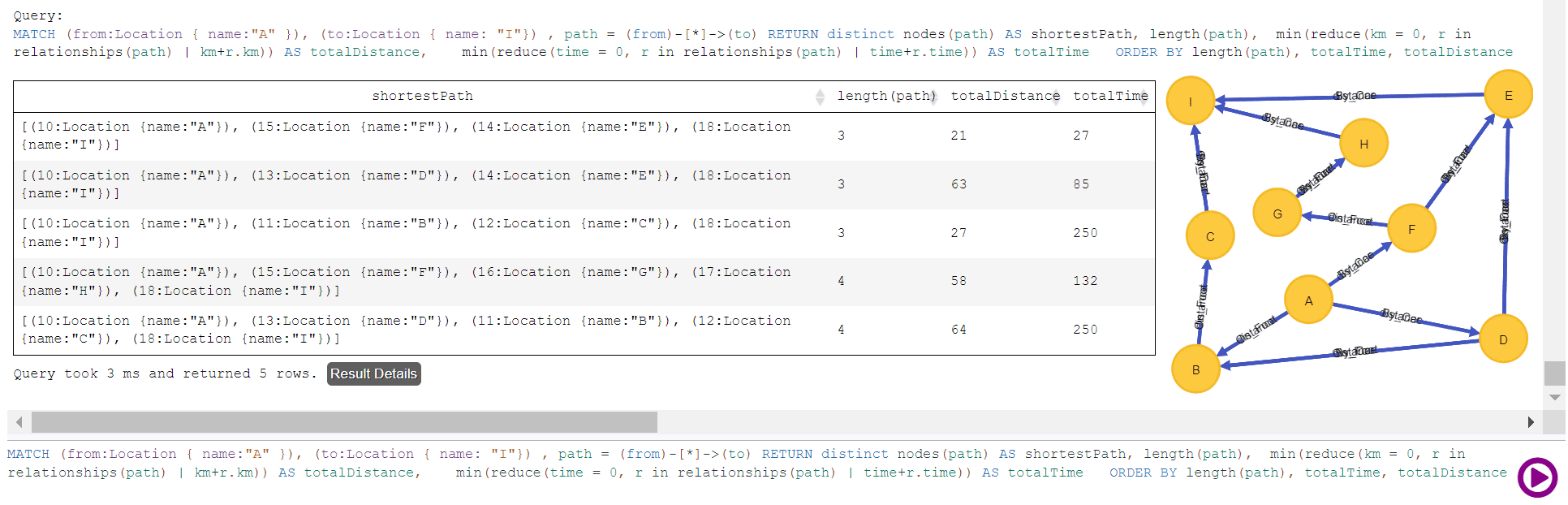 Добавим к этому запросу вычисление времени прохождении путей и сортировку по полям. А поскольку нас интересует кратчайший путь, добавим агрегатную функцию вычисления минимума от времени и расстояния. А чтобы исключить дублирование путей из-за разных отношений между некоторыми вершинами графа, добавим функцию дедубликации узлов пути distinct nodes(path).