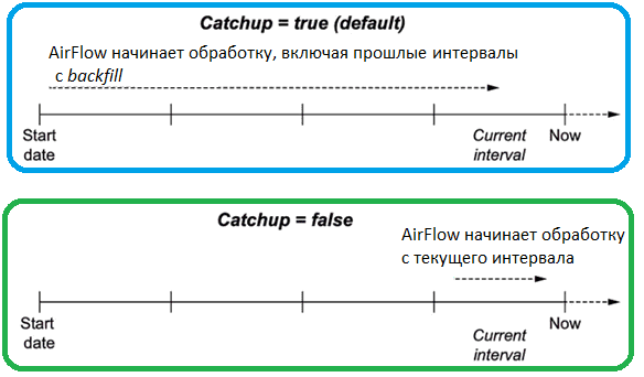 По умолчанию AirFlow будет запускать любые прошлые запланированные интервалы, которые не были запущены, заполняя прошлые данные. Чтобы избежать этого, нужно явно передать параметр catch=False в определении DAG: