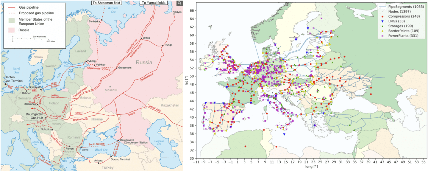 Российский природный газ поступает в страны Европы по трубопроводам и составляет около трети всего газа, используемого на той территории. Этот российский энергоресурс играет значительную роль в энергетическом балансе европейских стран. Газотранспортные сети состоят из различных компонентов: трубопроводы, компрессоры, станции и пр. Отчет Ольденбургского Института сетевых энергетических систем DLR за 2020 год, опубликованный в результате 3-хлетнего проекта SciGRID_gas, финансируемого Федеральным министерством экономики и энергетики Германии, содержит следующие сведения о компонентах газотранспортной сети: