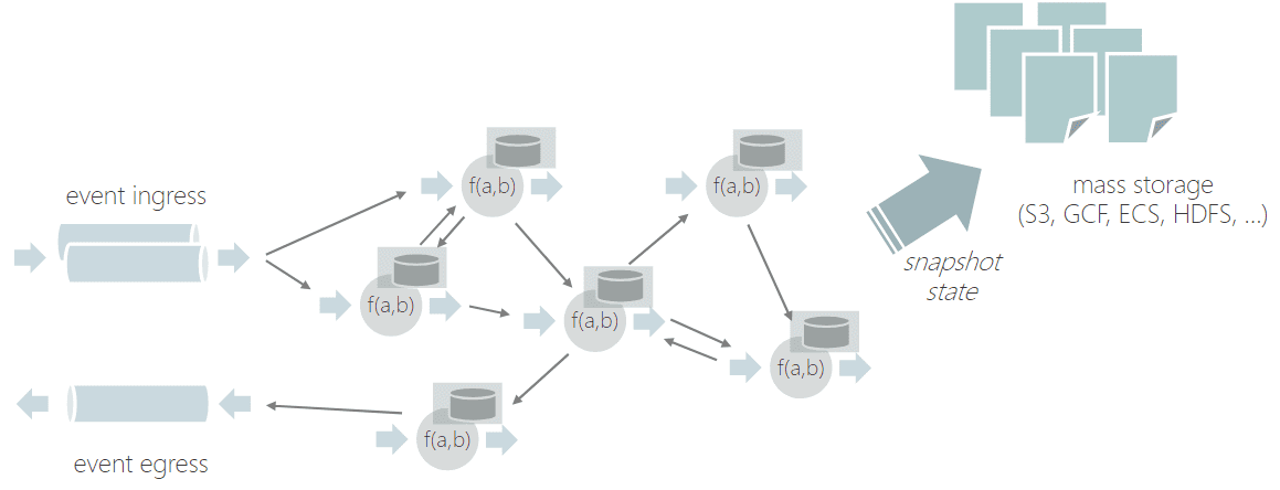 Одной из основных сильных сторон Apache Flink является его способность обеспечивать отказоустойчивое локальное состояние. Находясь внутри функции, пока она выполняет некоторые вычисления, разработчик всегда работает с локальным состоянием в локальных переменных, что гораздо проще обработки распределенного состояния. В случае сбоя все сохраненные состояния и сообщения откатываются, чтобы имитировать полностью безотказное выполнение. Эти гарантии отказоустойчивости позволяют отказаться от постоянного хранилища, т.е. базы данных. Вместо этого Stateful Functions использует проверенный механизм создания моментальных снимков Apache Flink.