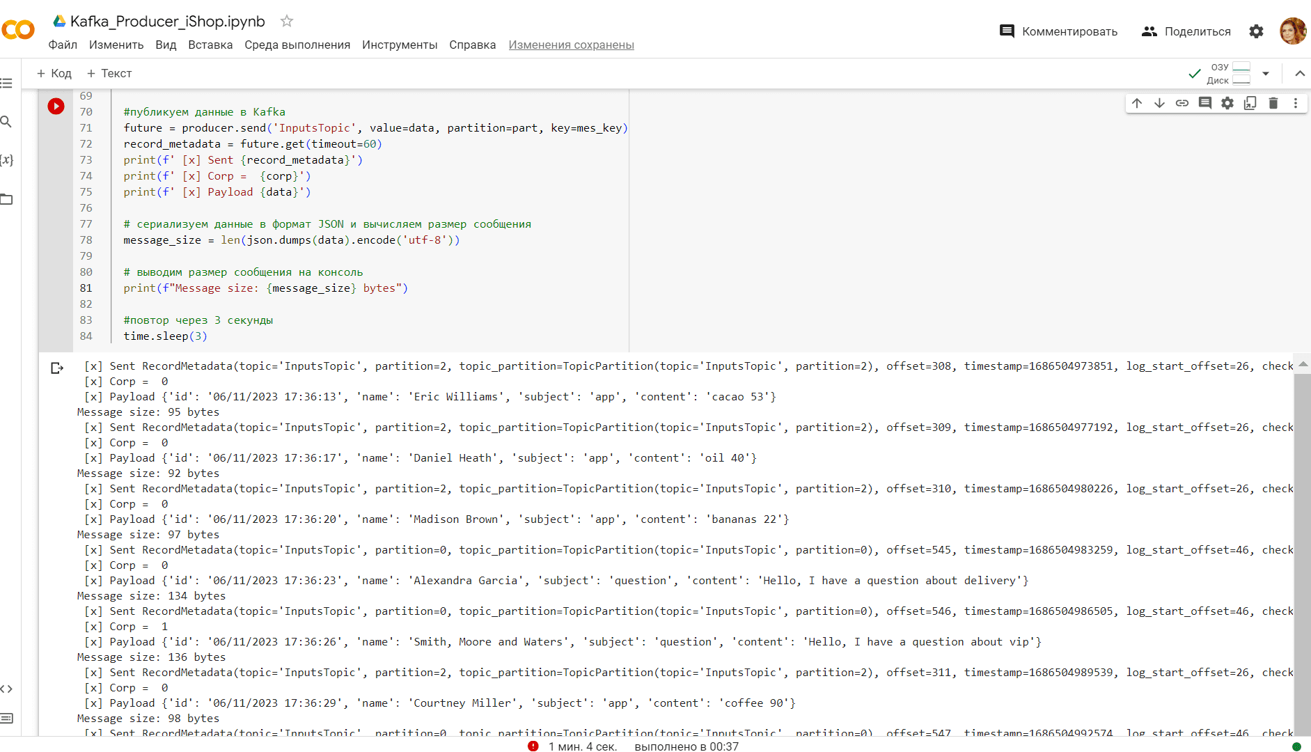 Запустив этот скрипт в Google Colab, получаем сообщения, опубликованные в Kafka согласно ранее заданной логике распределения по разделам: