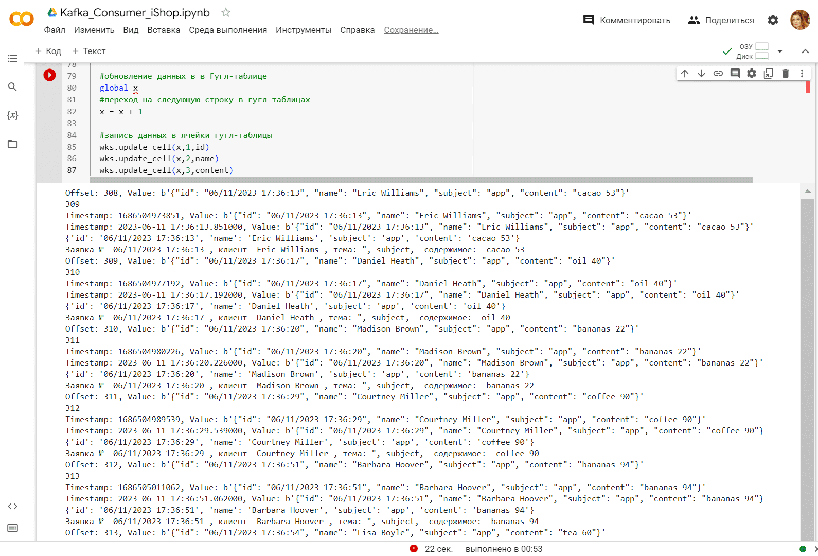 ####################################ячейка в Google Colab №2 - потребление из Kafka###########################################