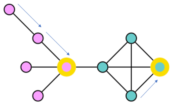 Поэтому можно использовать Python-пакет kmedoids, отправив ему на вход матрицу расстояний, полученную с помощью алгоритмов расчета кратчайшего пути, поддерживаемых в Graph Data Science. Поскольку любой узел является кандидатом на роль медоида, граф должен быть связным графом. Для этого можно применить методы связанных компонент, о которых мы писали здесь и здесь. Как только будут выявлены связанные компоненты, можно дополнительно сегментировать самые крупные компоненты из них с помощью алгоритмов обнаружения сообществ. Библиотека Graph Data Science в Neo4j включает несколько быстрых алгоритмов обнаружения сообщества: Leiden, Louvain и Label Propagation. Эти алгоритмы идентифицируют сообщества плотно связанных узлов в графе. Но они могут образовывать длинный хвост небольших сообществ в менее связанных частях графа, что следует учитывать при их использовании.