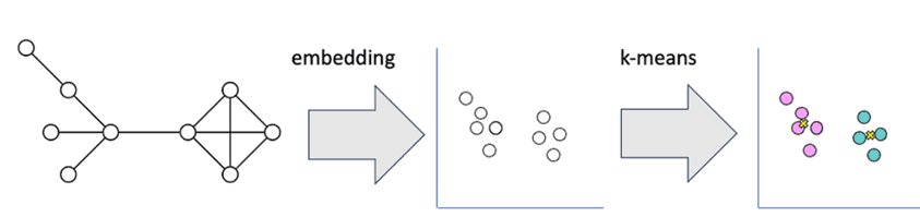 Чтобы использовать алгоритм k-means для данных графа, нужно представить его топологию в векторном пространстве. Это можно сделать, применив алгоритм внедрения узлов, например, Fast Random Projection, чтобы выразить положение каждого узла в графе в виде вектора. Затем можно рассчитать расстояние между каждым вектором и центроидами кластера, используя евклидово расстояние. Этап внедрения усложняет модель и ухудшает ее интерпретируемость (объяснимость).