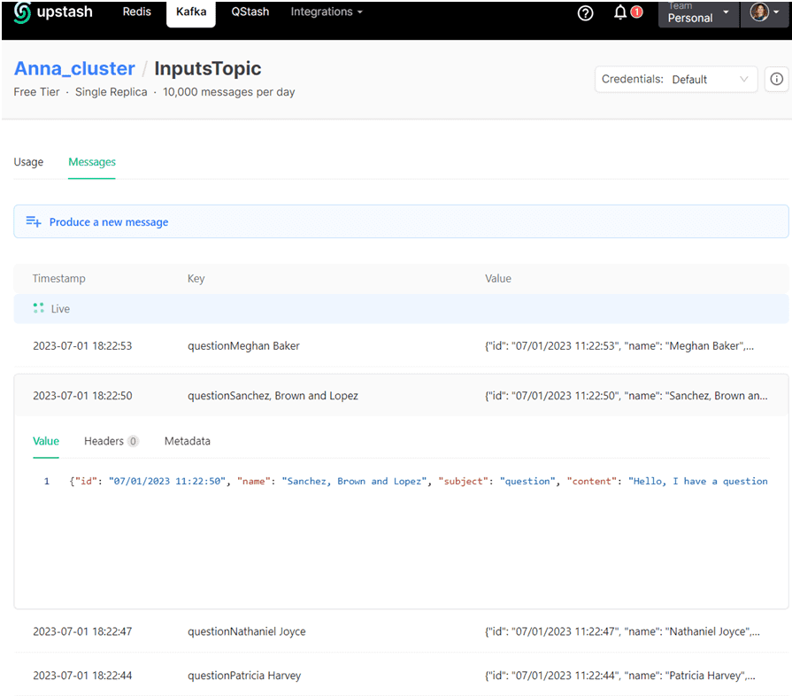 Как обычно, мой экземпляр Kafka развернут в облачной платформе Upstash, в GUI которой можно посмотреть публикуемые сообщения: