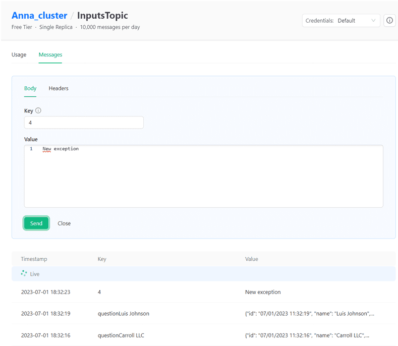 В этом Python-коде в бесконечном цикле потребления данных добавлена обработка исключений, если структура данных полезной нагрузки сообщения будет отличаться от ожидаемой. Например, в GUI платформы Upstash я вручную опубликовала новое сообщение совершенно другой структуры, задав ключ распределения так, чтобы оно попало в раздел 1, куда публикуются заявки корпоративных клиентов: