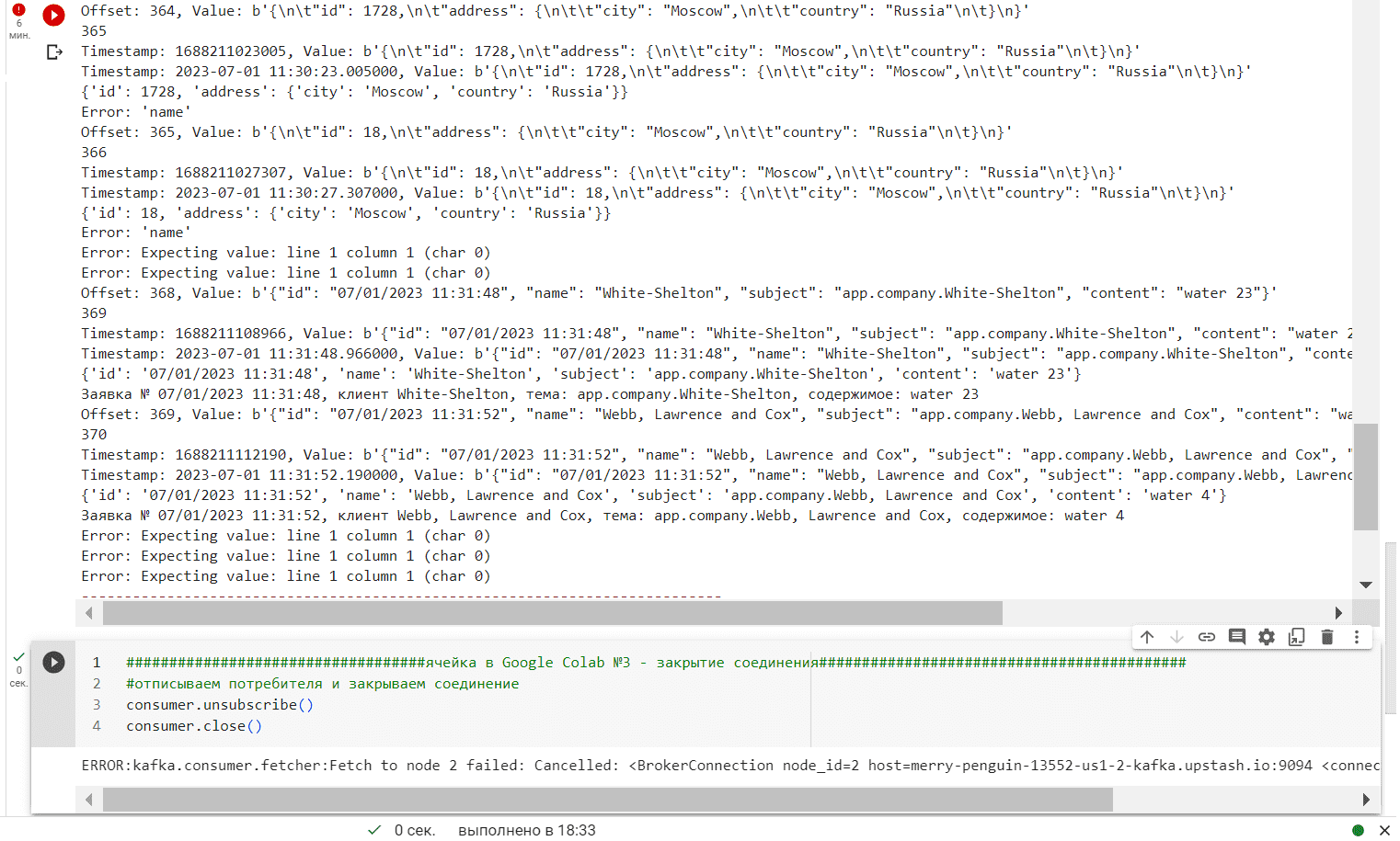 ####################################ячейка в Google Colab №2 - потребление из Kafka###########################################