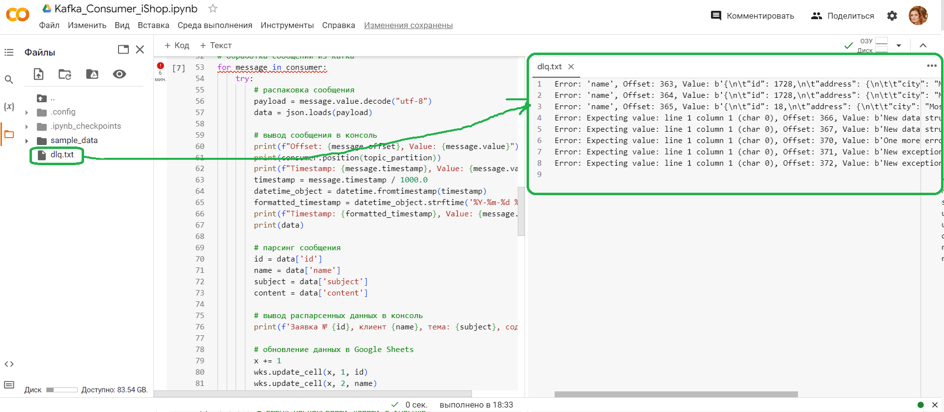 Сообщения, которые потребитель не смог обработать, т.е. те, на которые возникло исключение, записываются в лог-файл под названием dlq.txt.