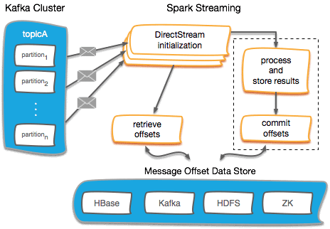 • Исключение дублирования сообщений за счет стратегии «строго однократная доставка» — считываемые фрагменты отслеживаются в Kafka – Spark Streaming с помощью механизмов контрольных точек (checkpoints), устраняя несогласованность между Spark Streaming и Zookeeper/Kafka. Таким образом, даже при отказах системы, Spark Streaming получает каждую запись строго однократно. Отметим, что в этом случае нужна гарантия атомарности транзакции, когда во внешнем хранилище (HDFS, HBase, S3 и других сторонних системах хранения информации) сохраняются сами результаты и смещения топика Кафка. Автоматически эти смещения (offset) в Zookeeper не обновляются, поэтому требуется самостоятельно обращаться к каждому пакету, обновляя Зукипер [1].