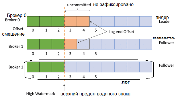 Чтобы предотвратить чтение противоречивых данных приложениями-потребителями, Kafka использует механизм водяных знаков (watermark). Потребители могут считывать сообщения только до его верхнего предела, который представляет собой минимальное смещение нижнего конца во всех синхронизированных репликах этого раздела. Этот предел монотонно растет и определяется конфигурацией replica.high.watermark.checkpoint.interval.ms — частота, с которой верхний предел водяного знака сохраняется на диск.