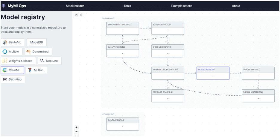 Начать пользоваться сервисом можно без регистрации. Одна из ключевых возможностей – построитель стека технологий (Stack builder). Благодаря тому, что в шаблоне уже выделены основные компоненты, поддерживающие этапы жизненного цикла ML-модели, работа пользователя сводится к выбору используемых инструментов. Выделив определенный компонент, можно указать, с помощью какого фреймворка или библиотеки он будет реализован. Например, для регистрации ML-моделей в централизованном репозитории, чтобы их отслеживать и разворачивать, предлагается использовать ClearML, BentoML и другие подобные инструменты.