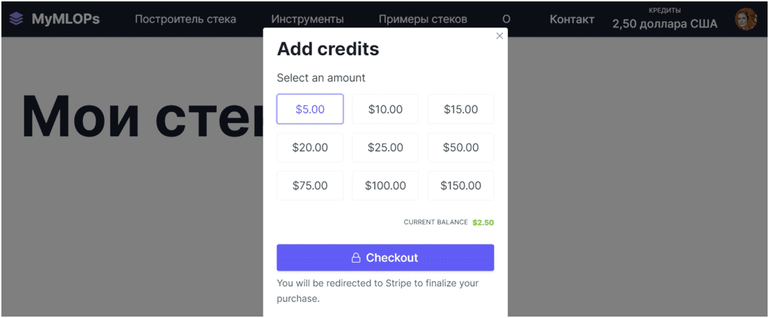 За время переходов по этим сервисам я успела потратить выданные мне кредиты. Чтобы продолжить пользоваться возможностями MyMLOps, следует пополнить счет.