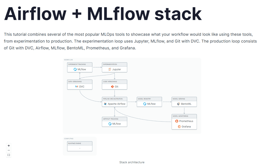 Чтобы реализовать идеи концепции MLOps автоматизации всего жизненного цикл системы машинного обучения, от подготовки данных и обучения модели до ее развертывания и мониторинга, необходимо обеспечить соответствующую инфраструктуру. К компонентам такой инфраструктуры относятся средства контроля версий ПО и датасетов, инструменты непрерывной интеграции и непрерывного развертывания (CI/CD), а также системы мониторинга производительности и качества ML-модели. Чтобы организовать такую инфраструктуру, необходимо сперва спроектировать MLOps-конвейер. Обычно это делается в виде примитивного рисунка от руки или визуальной схемы в графическом редакторе. Также можно заполнить шаблон, который отражает структуру взаимодействия основных MLOps-компонентов. Такое примитивное проектирование хоть и позволяет определиться с технологиями и начать действовать, оно не слишком приближает момент запуска MLOps-конвейера.