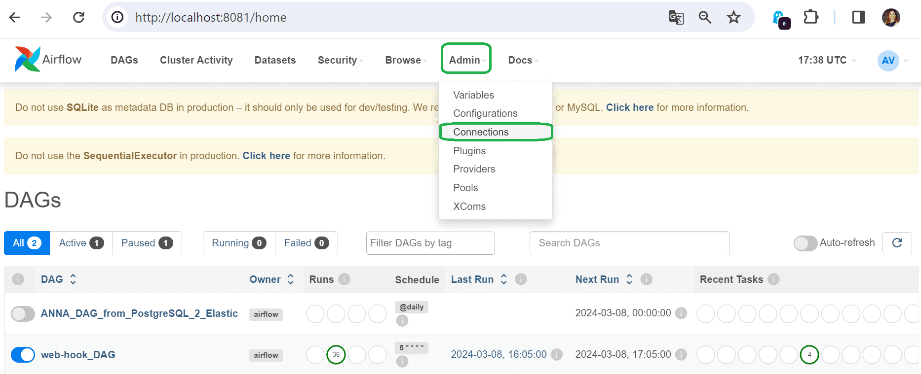 Поскольку теперь я запускаю docker-контейнер с Apache AirFlow в режиме standalone на своей локальной машине, чтобы выйти в веб-интерфейс, мне достаточно обратиться к localhost и порту, на котором развернуто это приложение. Добавить новое подключение к внешней системе надо в разделе Admin/Connections.