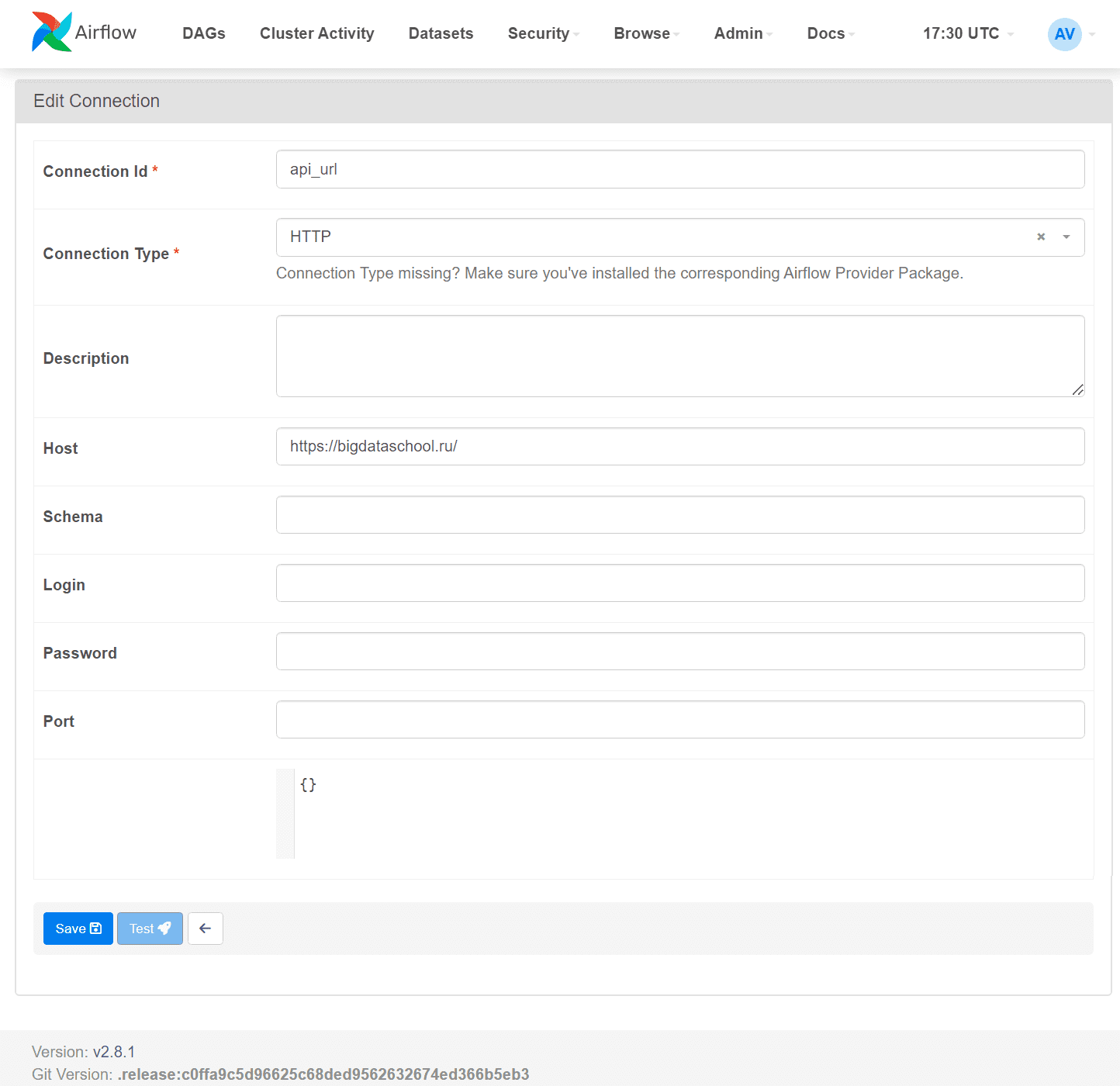 Хуки в AirFlow интегрируются с подключениями (Connection) для сбора учетных данных – набор параметров: имя пользователя, пароль и хост, а также тип внешней системы. Также подключение имеет уникальное имя, называемое conn_id. Все эти параметры можно настроить программно, что я показывала здесь, или в пользовательском интерфейсе фреймворка. Например, я хочу проверять доступность нашего сайта, т.е. именно он будет выступать в роли внешней системы. Для этого надо задать его адрес в настройках подключения, чтобы использовать методы http-хуков.