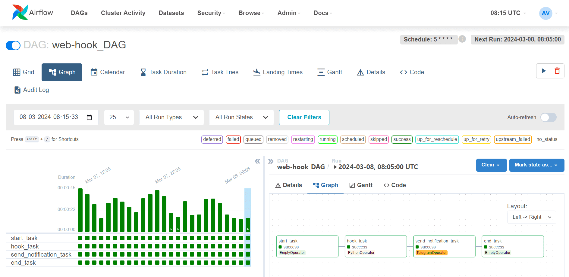 Функция hook_function() из hook_task.py импортируется в код DAG, который, помимо Python-оператора с вызовом этой функции также содержит Dummy-операторы в качестве стартовой и финишной точки конвейера, и Telegram-оператор для передачи результатов в месенджер. Расписание запуска установлено на первые 5 минут в начале каждого часа, что задано в параметре schedule_interval.