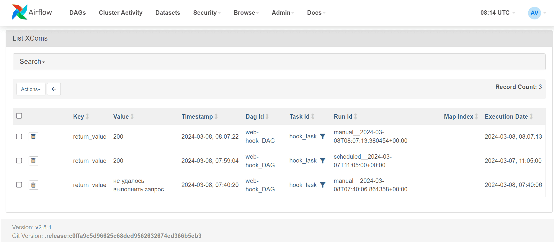 Задача hook_task передает результаты выполнения, т.е. статус HTTP-вызова к проверяемому сайту или ошибку, задаче send_notification_task для рассылки уведомлений в Телеграм, с помощью механизма XCom. Просмотреть значение переданных переменных можно также в веб-интерфейсе фреймворка, в разделе Admin/XComs.