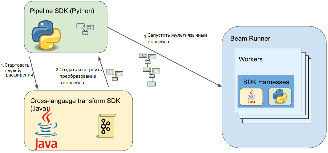Для таких кросс-языковых преобразований Beam использует службу расширения , которая создает и внедряет в конвейер фрагменты, специфичные для конкретного языка. К примеру, конвейер Beam на Python запускает локальную службу расширения Java для работы с Apache Kafka, чтобы создать и внедрить Java-фрагменты кросс-языкового преобразования. Затем SDK загружает и размещает необходимые зависимости Java для выполнения этих преобразований. Во время выполнения Beam-движок (Runner) будет выполнять преобразования Python и Java для запуска конвейера.