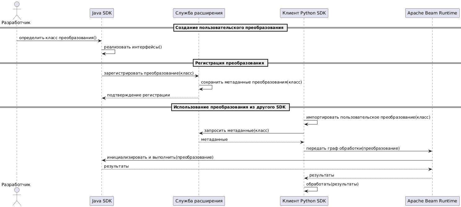 Последовательность создания, регистрации и использования пользовательского переносимого преобразования для мультиязычных конвейеров Apache Beam можно представить так.