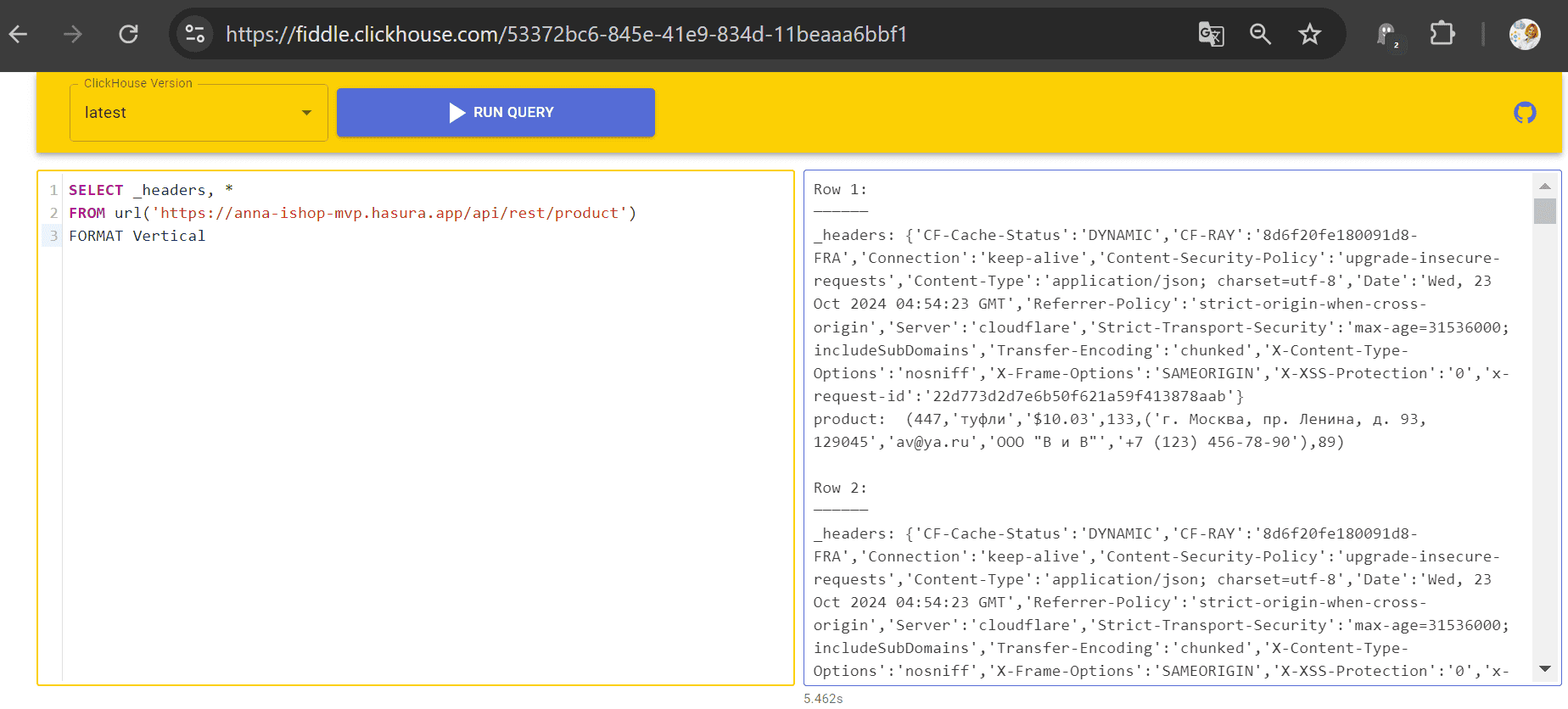 При интеграции с внешними ресурсами полезно получать заголовки HTTP-ответов. Теперь это можно сделать благодаря виртуальному столбцу _headers в SELECT-запросе FROM url. Результат возвращает словарь заголовков HTTP-ответов при запросе удаленного сервера. Протестируем эту функцию на Clickhouse в открытой песочнице. Например, запрос к конечной точке моего проекта интернет-магазина на платформе Hasura, доступной для GET-запроса без аутентификационных данных, возвращает такой результат: