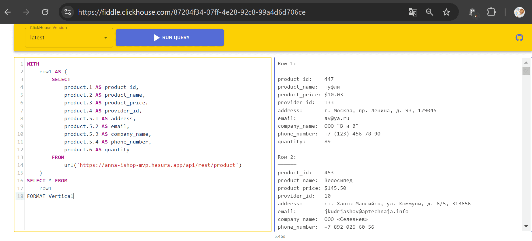 Дальше с этим можно поработать, например, чтобы получить данные о товарах и их производителях. Для этого нужно немного преобразовать SQL-запрос Clickhouse:
