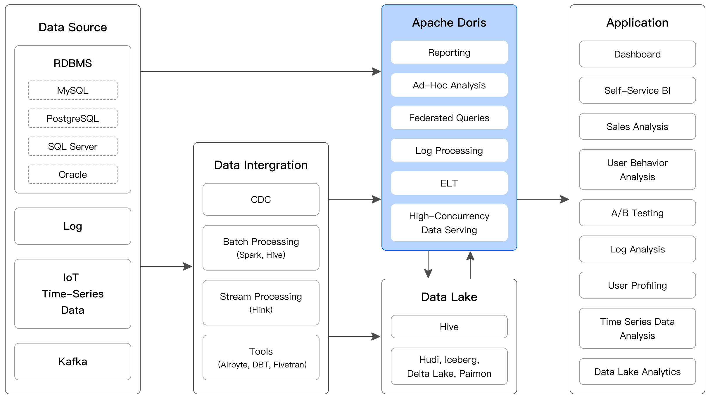 В свою очередь, Doris отлично справляется с высококонкурентными запросами и запросами на соединение, а несколько видов индексов позволяют ускорить поиска. Кроме того, Doris поддерживает крупномасштабное обновление и высокочастотную запись в реальном времени, а также частичное обновление столбцов.