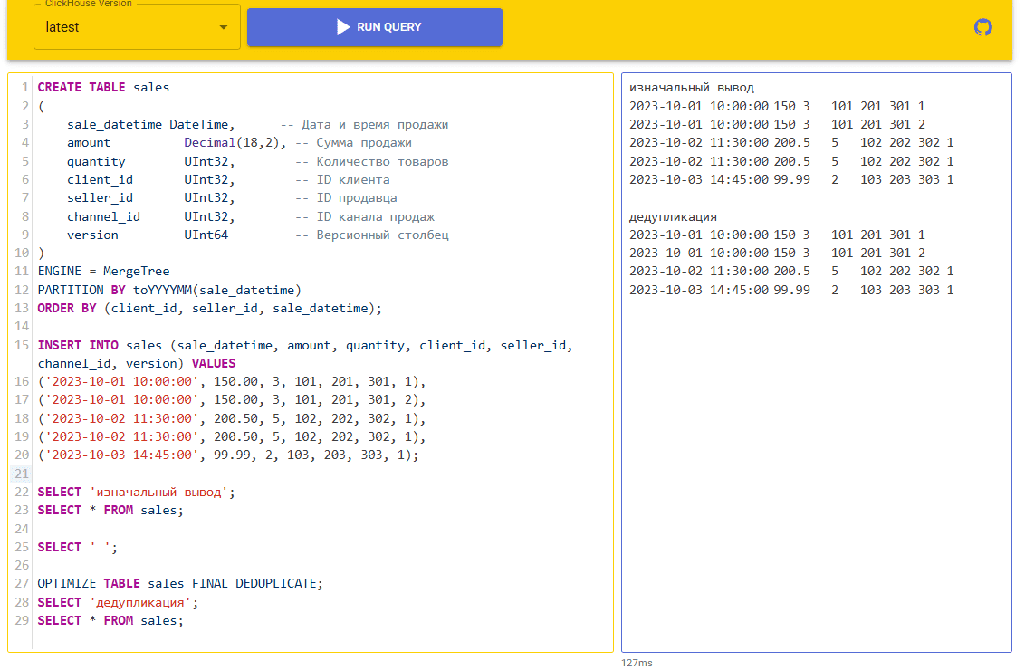 Затем выведем исходные данные и запустим дедупликацию с помощью OPTIMIZE. Чтобы ClickHouse выполнил полное объединение всех частей данных во всей таблице, а не только к видимой части данных, добавим к запросу модификатор FINAL, об особенностях работы которого мы писали здесь: