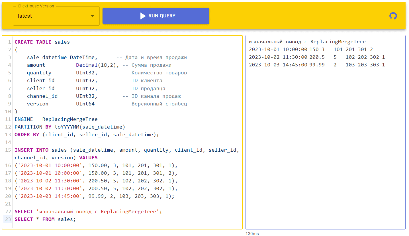 Хотя запрос OPTIMIZE работает, удаляя дубли, он приводит к чтению и записи большого объёма данных. При использовании движка ReplacingMergeTree дедупликация запускается в фоновом режиме в неизвестный момент времени, без гарантии отсутствия дублей в таблице в определенный момент времени. Кроме того, ReplacingMergeTree гарантирует отсутствие дублей во вставке (т. е. если в INSERT-запросе есть дубли — движок их удалит, и в таблицу попадут только уникальные значения). Изменим табличный движок в ранее рассмотренном примере.