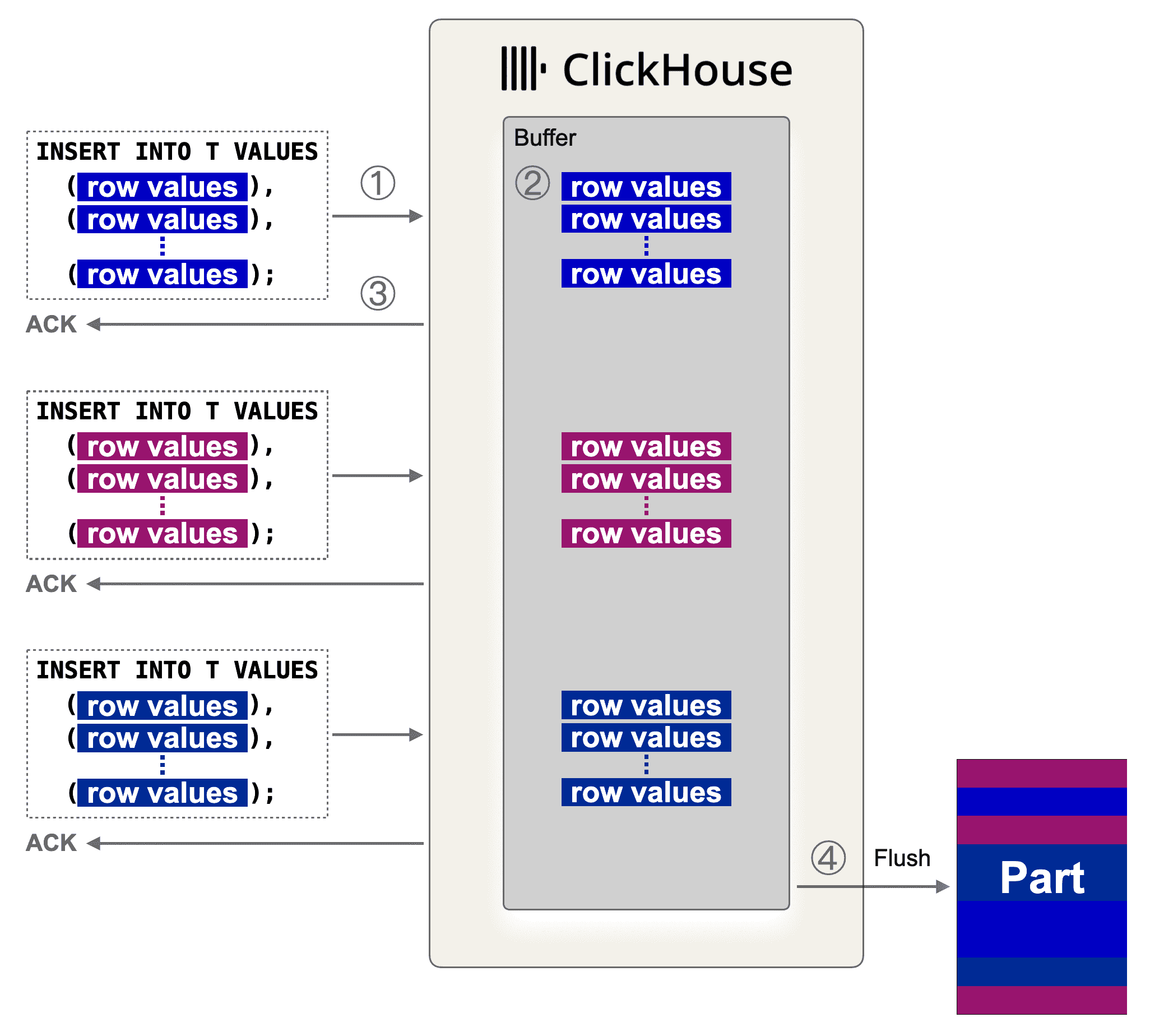 При wait_for_async_insert = 0 для асинхронных вставок, когда ClickHouse получает запрос на вставку, данные запроса немедленно записываются в буфер памяти. После этого запрос на вставку возвращается отправителю с подтверждением вставки. Когда происходит следующая регулярная очистка буфера, данные буфера сортируются и записываются как одна или несколько частей данных в хранилище базы данных. Перед очисткой буфера данные из других запросов на вставку могут быть собраны в буфере.