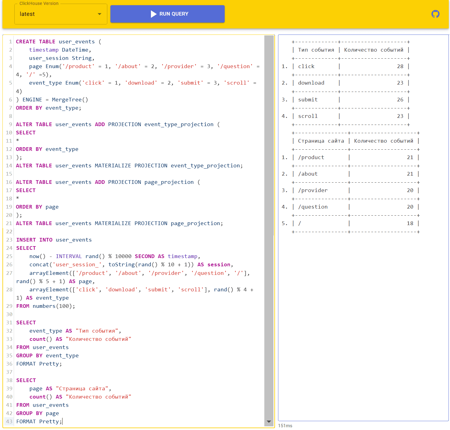 Сделаем агрегатные запросы о количестве событий пользовательского поведения, сгруппированных по типу и по страницам. Чтобы вывод результатов был более наглядным, укажем формат вывода Pretty. При выполнении этих запросов Clickhouse сам будет использовать ранее созданные проекции, выбирая наиболее подходящую.