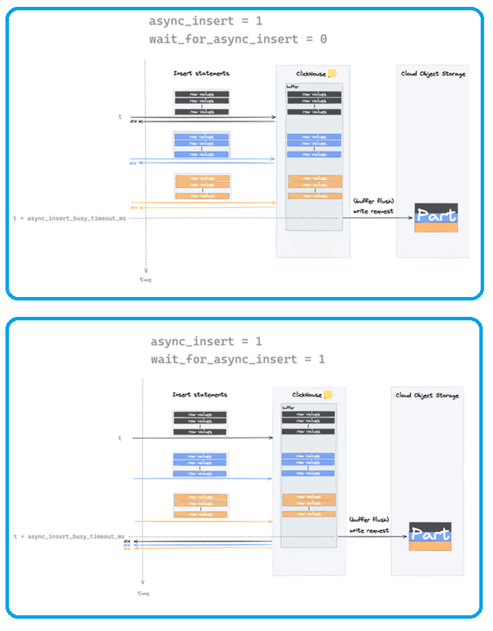 С помощью параметра wait_for_async_insert можно указать, нужно ли возвращать подтверждение после вставки данных в буфер, задав ему значение 0 или делать это по умолчанию после записи части данных после очистки буфера, установив wait_for_async_insert = 1.