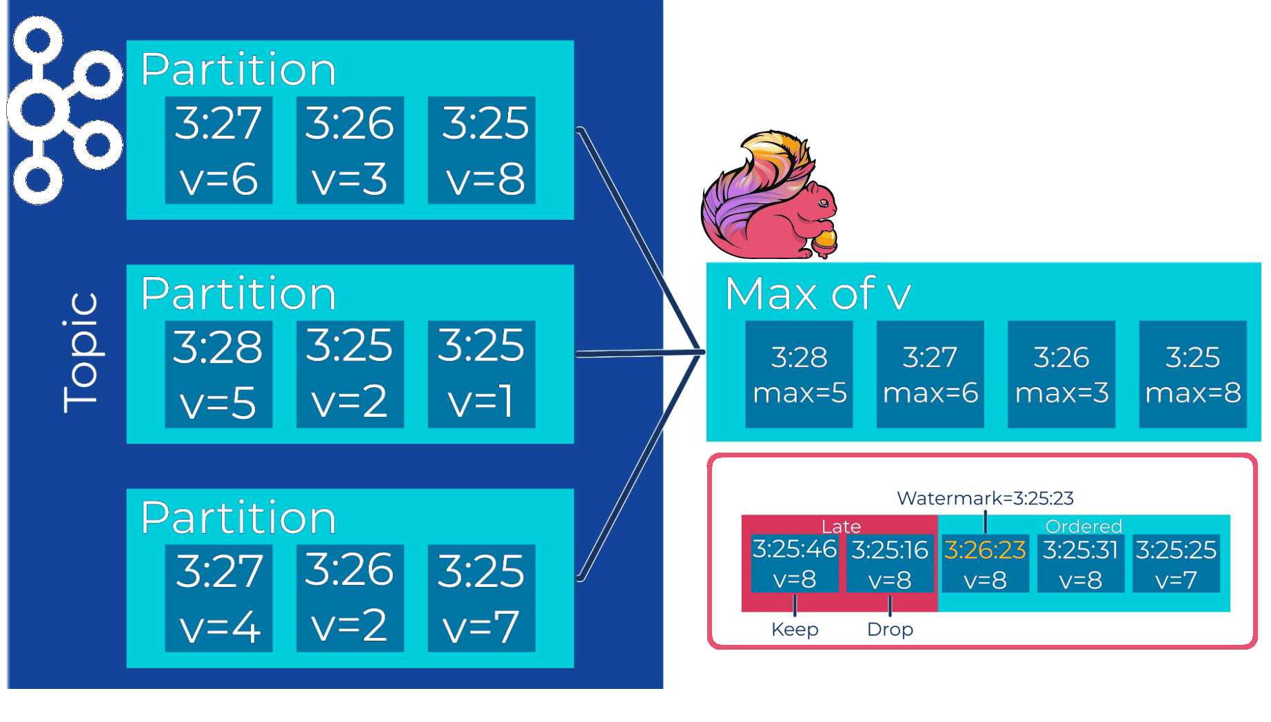 Но в случае агрегаций по времени упорядочивание очень важно. Например, когда нужно найти максимальное значение поля в пределах одного минутного временного окна. По мере того, как каждая запись проходит через оператор, он сравнивает поле с текущим максимумом. Если он находит большее значение, он может обновить сохраненный максимум. Оператор ищет максимальное значение в пределах одной минуты, проверяя отметку времени у каждого сообщения, чтобы закрыть текущее окно обработки данных и открыть следующее. В упорядоченном потоке это не проблема. Но, когда сообщения приходят не по порядку, приходится делать выбор из следующих вариантов: