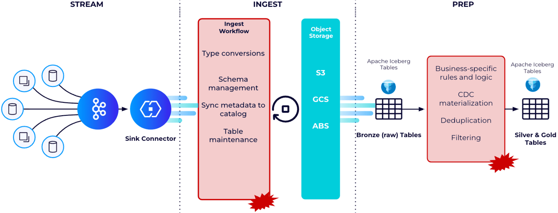 Например, передача операционных данных из Kafka в корпоративные хранилища и озера данных в формате Apache Iceberg — довольно сложный, дорогостоящий и подверженный ошибкам процесс, требующий создания пользовательских конвейеров данных. В этих пользовательских конвейерах данных необходимо передавать данные, используя sink-коннекторы, очищать их, управлять схемой, материализовать CDC-потоки, преобразовывать и сжимать данные, а также сохранять их в форматах таблиц Parquet и Iceberg. Этот сложный рабочий процесс требует значительных усилий и опыта для обеспечения согласованности данных и соответствия требованиям по качеству и производительности.