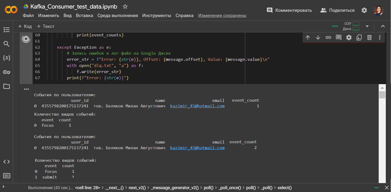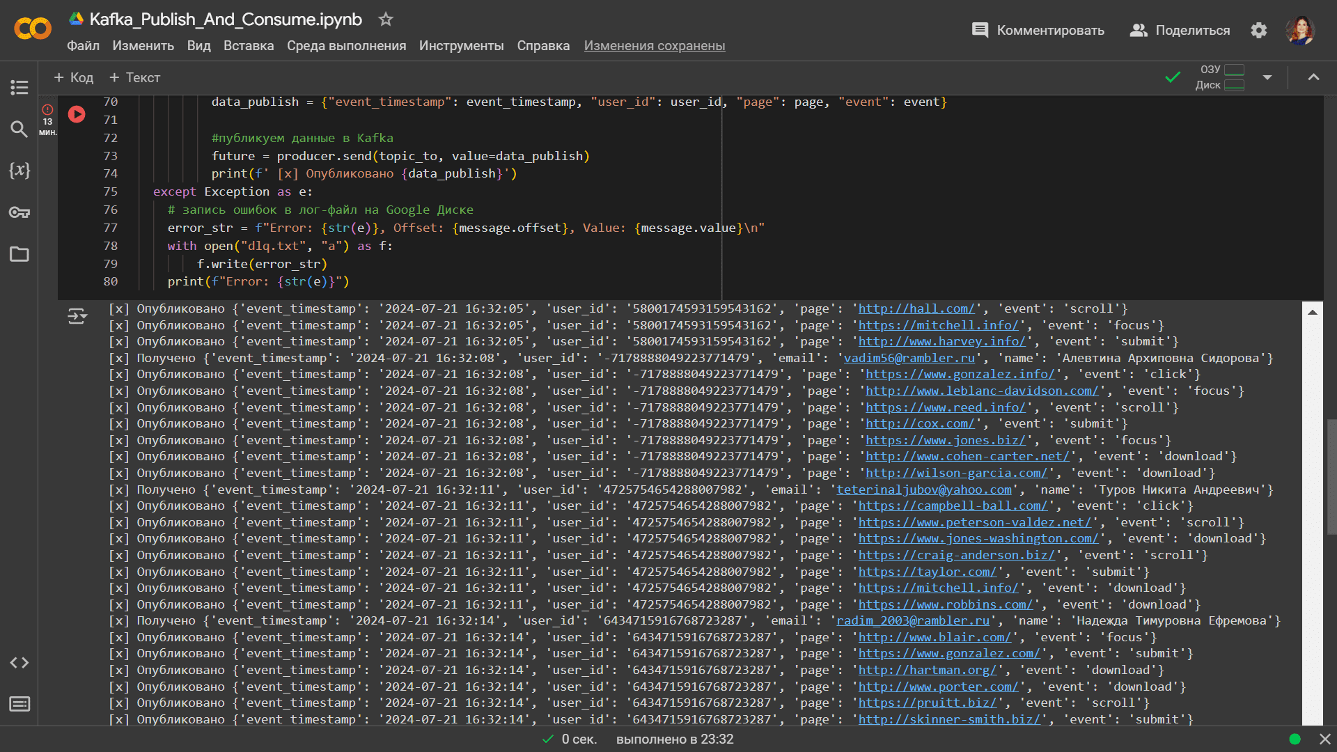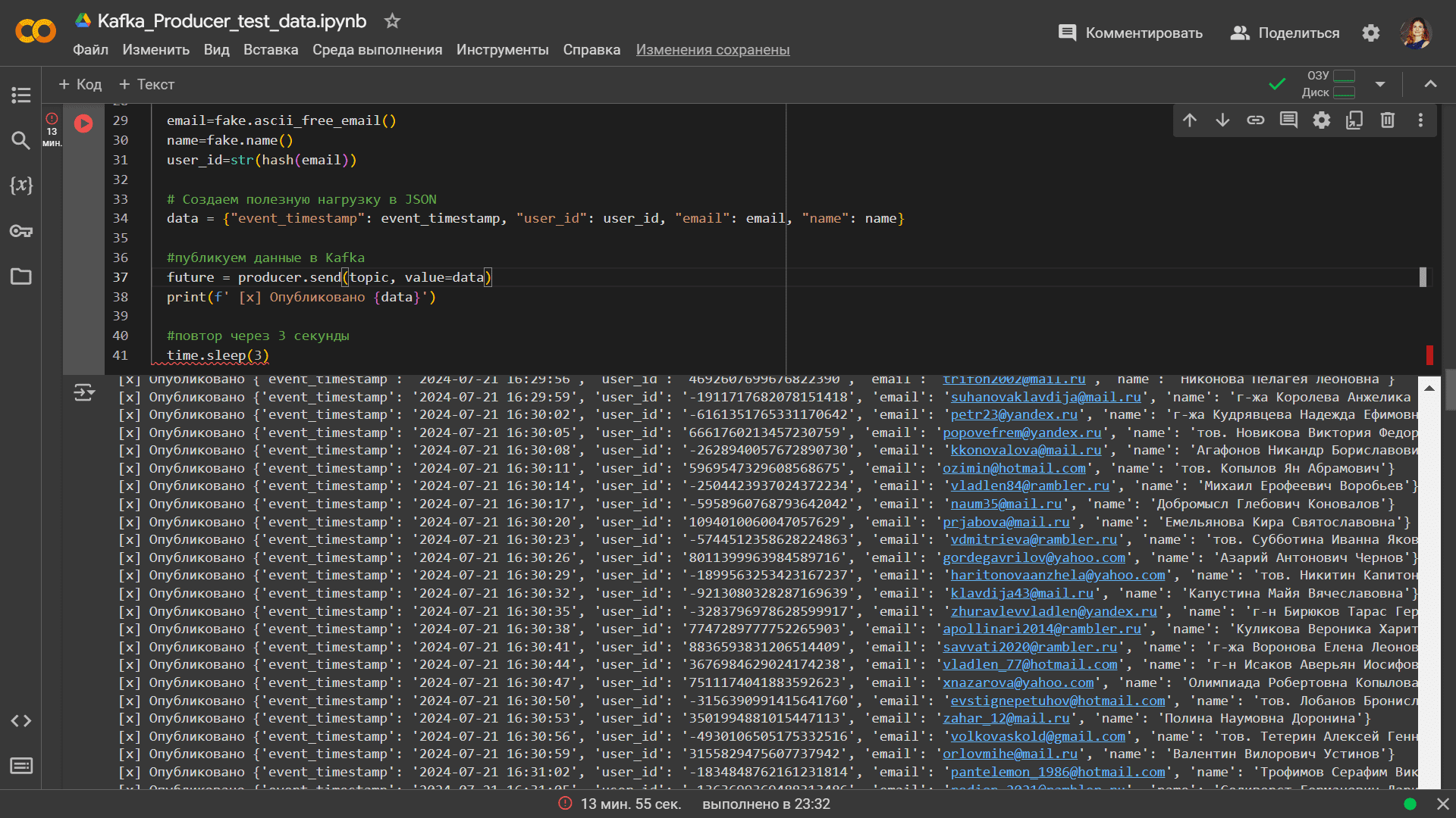 Как обычно, экземпляр Kafka у меня развернут в облачной платформе Upstash, а писать приложения я буду на Python, используя библиотеку kafka-python. Код приложения-продюсера, которое каждые 3 секунды генерирует фейковые данные о пользователях, выглядит так: