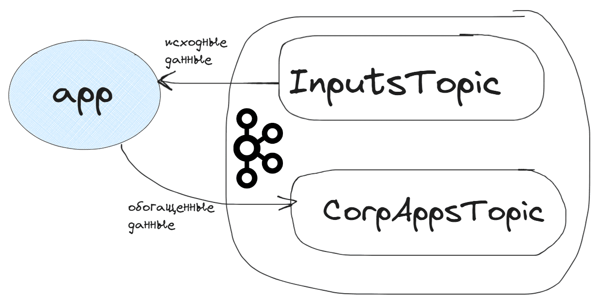 Рассмотрим в качестве примера приложение, которое потребляет входные данные в потоковый датафрейм из одного топика Kafka (InputsTopic), обогащает их и записывает в другой топик (CorpAppsTopic). Таким образом, одно и то же приложение одновременно является и продюсером и потребителем Kafka.