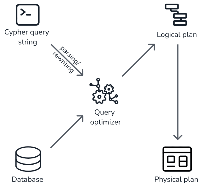 Запрос Cypher начинается с декларативного запроса, представленного в виде строки, описывающей шаблон графа, который необходимо сопоставить в базе данных. После анализа строка запроса проходит через оптимизатор (планировщик) запросов, который создает императивный логический план, для определения наиболее эффективного способа выполнения запроса с учетом текущего состояния базы данных. Соответствующая информация о текущем состоянии базы данных включает в себя доступные индексы и ограничения, а также различную статистику, поддерживаемую базой данных. Планировщик Cypher использует эту информацию, чтобы определить, какие шаблоны доступа создадут лучший план выполнения.