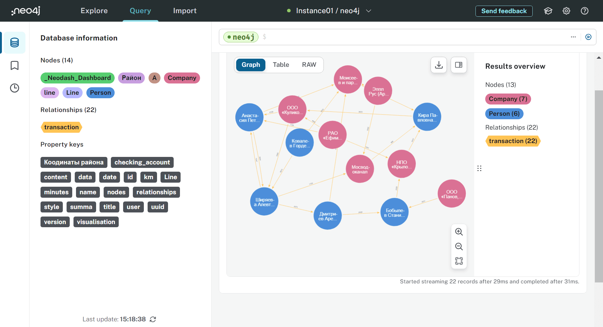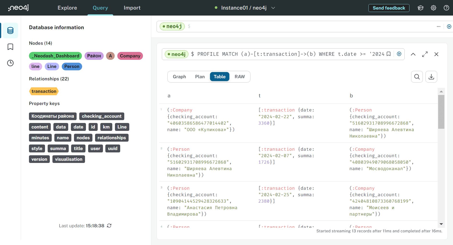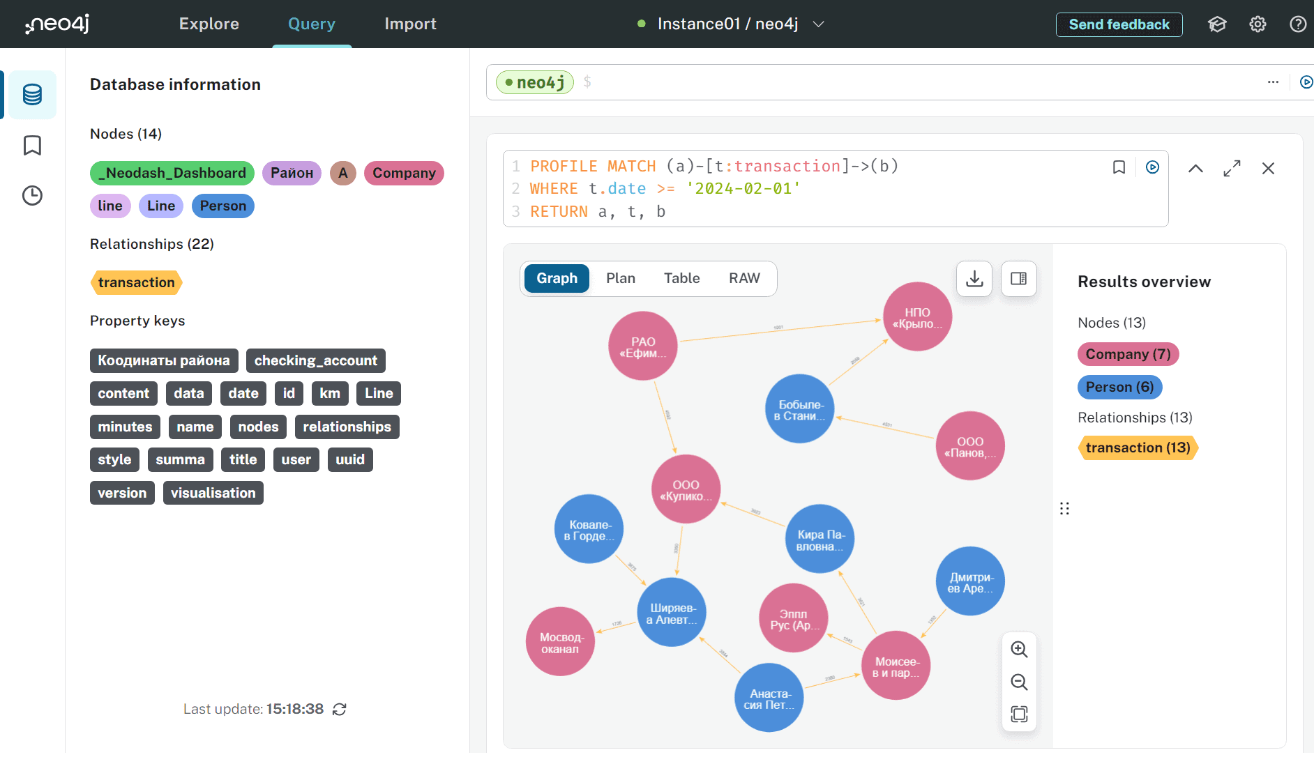 В качестве примера возьмем граф банковских транзакций между юрлицами (узлы с меткой Company) и физлицами, промаркированными метками Person. Каждый узел имеет название (в случае юрлиц) и имя (для физлица), а также номер расчетного счета. Связь между узлами означает совершенный денежный перевод, т.е. транзакцию на конкретную сумму и в определенную дату. Это два свойства связи. Для того, чтобы отобразить весь граф, достаточно следующего Cypher-запроса: