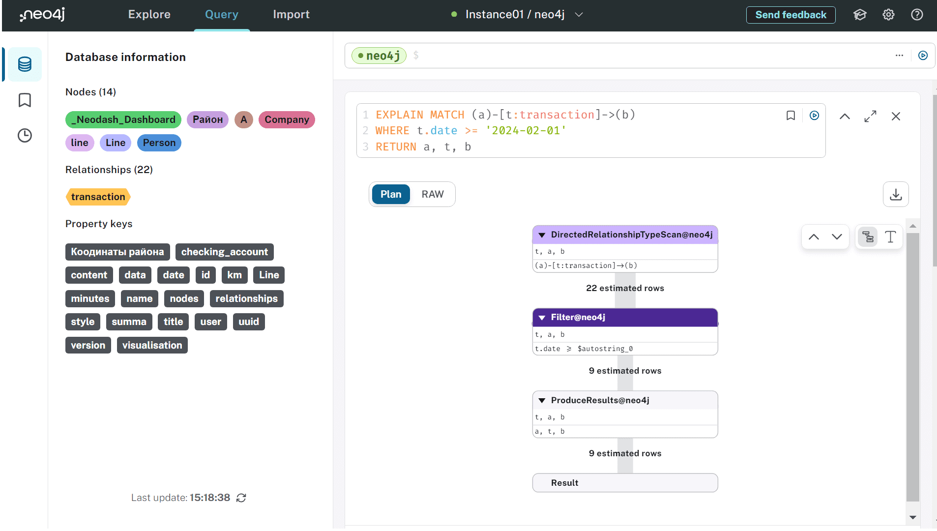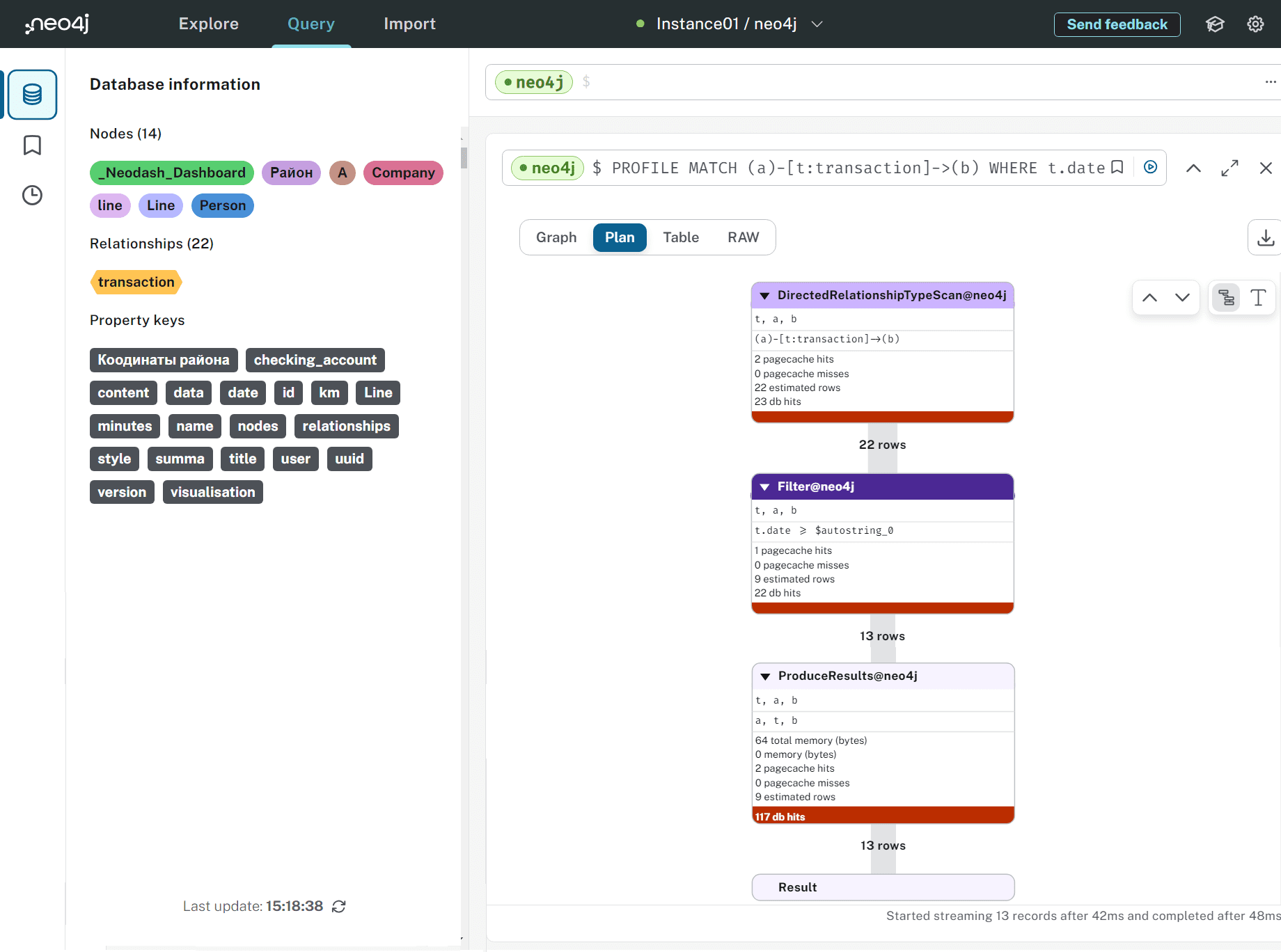 Чтобы просмотреть план запроса, надо добавить к нему оператор EXPLAIN. Это не запустит запрос, а только покажет дерево операторов, используемых для поиска желаемого результата. Сделаем это на примере из недавней статьи про визуализацию анализа финансовых транзакций в Neo4j с помощью построения дэшбордов в NeoDash.