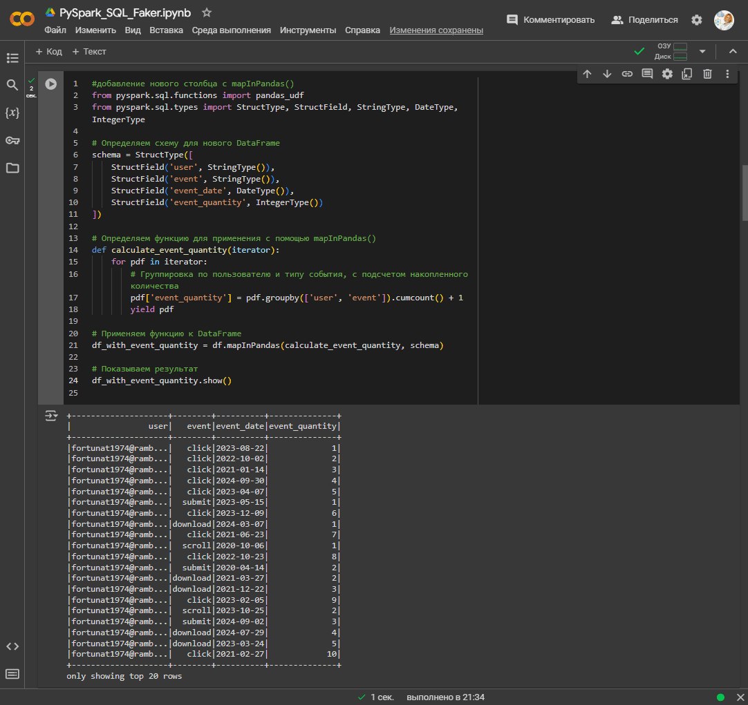 Этот код добавляет новый столбец в датафрейм с использованием функции mapInPandas() в Apache Spark. Поскольку схема исходного датафрейма меняется, надо определить новую схему с учетом добавленных столбцов. Функция calculate_event_quantity() применяется к каждой группе данных из исходного датафрейма. Она принимает итератор iterator, который содержит группы данных в виде датафреймов pandas. Данные группируются по пользователям и типам событий, количество которых итеративно увеличивается с помощью метода накопления суммы cumcount(). Метод mapInPandas() применяется к исходному датафрейму df, применяя функцию calculate_event_quantity и новую данных schema. Результат сохраняется в новом датафрейме df_with_event_quantity и выводится с помощью метода show().