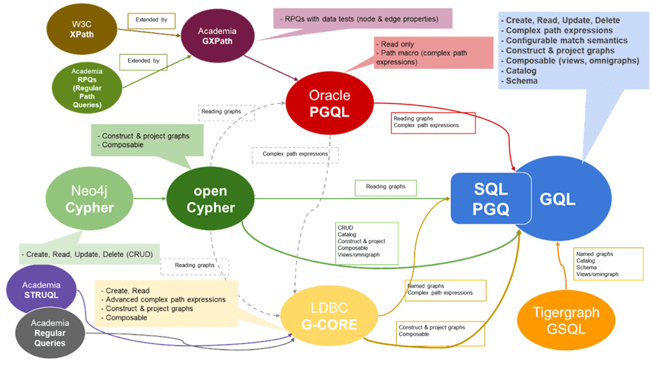 В рамках продвижения нашего курса по графовым алгоритмам в бизнес-приложениях мы часто рассказываем про инструменты хранения и анализа графовых данных. В частности, здесь рассматривали 5 языков запросов к графам, используемыми в популярных NoSQL-СУБД этой категории. Многообразие графовых баз данных привело к появлению множества языков запросов, каждый из которых используется внутри конкретного решения. Подобная ситуация когда-то наблюдалась и в области реляционных СУБД, пока в 1986 году не вышла первая официальная версия стандарта ANSI SQL, который сегодня используется во всех реляционных и многих NoSQL-базах.