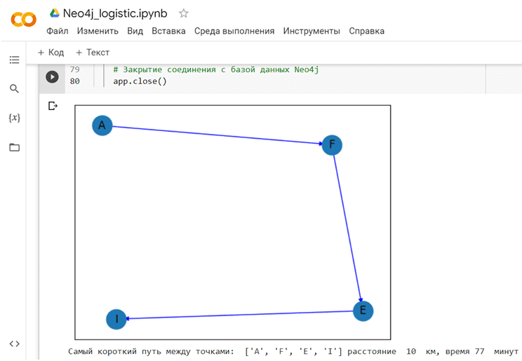 Далее напишем скрипт поиска кратчайшего пути, например, между точками A и I. Для визуализации найденного пути в области вывода Google Colab будем использовать библиотеку Networkx, которую мы ранее рассматривали здесь. Python-скрипт выглядит следующим образом: