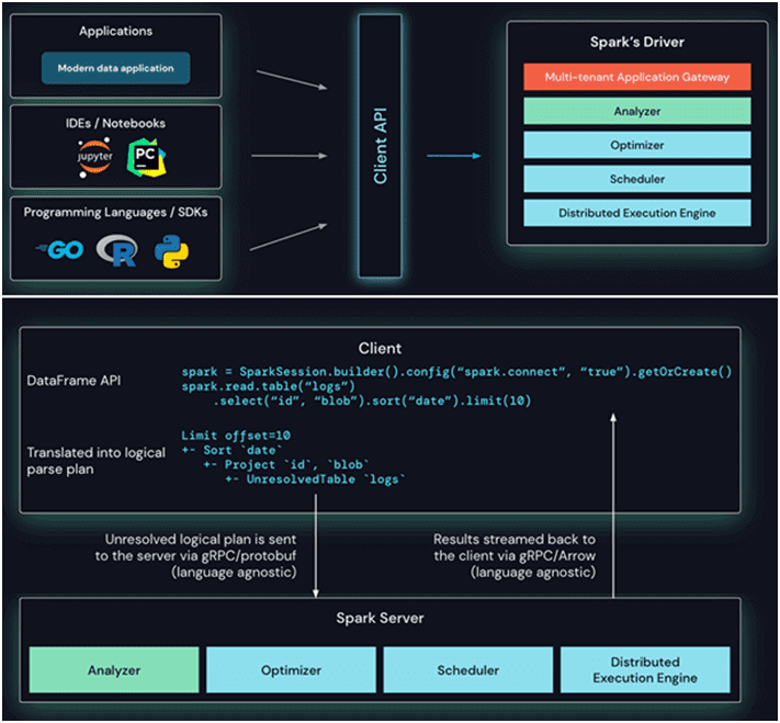 Клиентский API Spark Connect основан на API DataFrame, который использует неразрешенные логические планы в качестве независимого от языка протокола между клиентом и драйвером Spark. Этот клиент преобразует операции DataFrame в неразрешенные планы логических запросов, которые кодируются с использованием Protobuf и отправляются на сервер с помощью платформы gRPC. К примеру, последовательность операций с датафреймом в таблице логов преобразуется в логический план и отправляется на сервер.