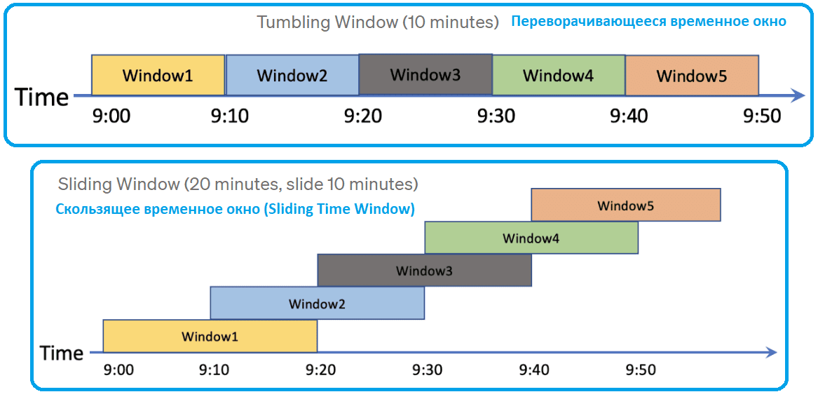 - Скользящее временное окно (Sliding Time Window) — в отличие от переворачивающегося временного окна, скользящее окно скользит по входящему потоку данных и может быть перекрывающимся. Пример кода на Scala для скользящего окна в 20 секунд с 10-секундным периодом скольжения выглядит так: